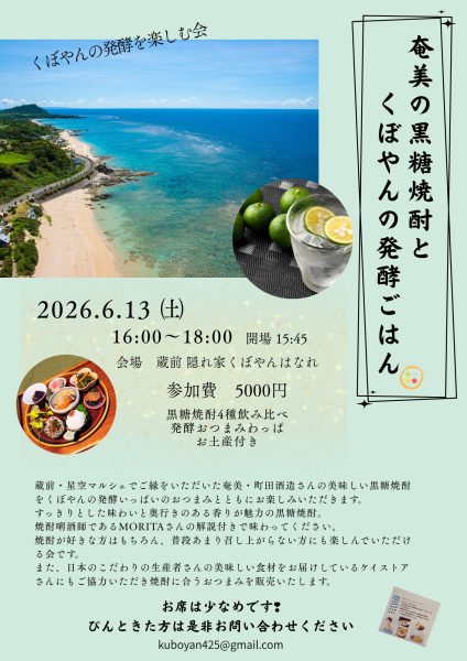 【イベント(東京)】蔵前隠れ家くぼやんはなれ様で『奄美の黒糖焼酎とくぼやんの発酵ごはんを楽しむ会』を開催します!